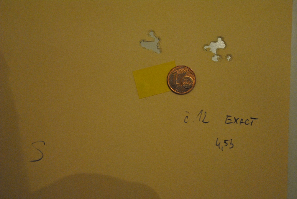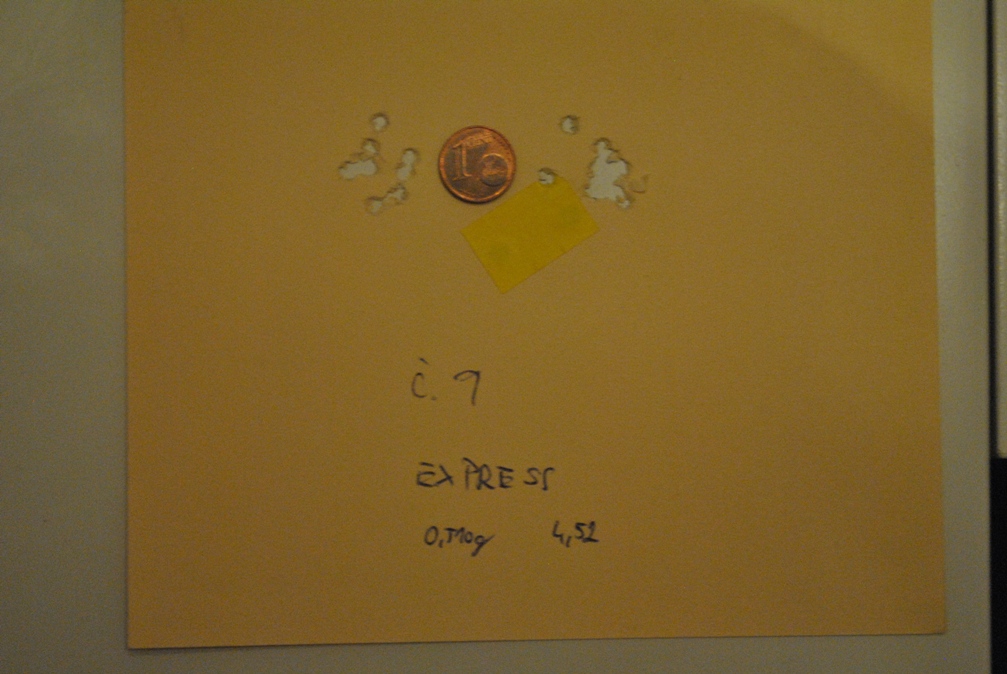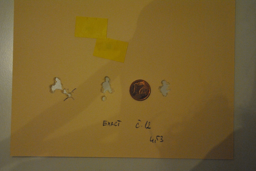 Neviem, ci by moj prispevok nebol vhodnejsi do vlakna o strelive, ale skusim to dat sem, lebo sa strielalo zo Steyra. Vyber streliva prebehol v piatok v tunely vyrobcu streliva JSB. Navsteva v JSB mi dala vela. Okrem vyberu streliva sme sa rozpravali o potrebe cistenia hlavni u Steyra. Co sposobuje zhorseny sustrel mi bolo predvedene potom na mojom, ktoreho hlaven som poriadne necistil nejaky ten rok, okrem vystrelenia par kusov filcovych valcekov. Ale postupne. JSB sme navstivili vdaka aktivite nasho prezidenta, ktora vznikla na zaklade Simoninho vysledku na MS v Litve. Pocas testu p. Prazan prisiel na to, co riesim dlhsi cas a co ma trapilo aj v Litve. To su nevysvetlitelne ulety. Nas kratky Steyr (Emilko) je velmi citlivy na vkladanie diabolky do hlavne. Nevieme, ci vstup upravil povodny majitel, alebo je to tak original, ale diabolku je treba vkladat zlahka, rovno s osou vyvrtu. Potom to striela uplne dokonale. Skusali sme rozne strelivo, ktore sa momentalne vyraba v cal. 4,51; 4,52; 4,53; Exact aj Expres. Expres Emilkovi nesedel, co mi nevadilo, nemusim robit novy tahak. Pri 4 druhoch streliva bol dosiahnuty sustrel CTC okolo 10 mm, co je velmi dobry vysledok. Na zaver bol problem vybrat strelivo. Ako hovoril p. Prazan, casto byva pri zbraniach ktore ludia k nim nosia opacny problem, vybrat zo zlych sustrelov ten najmenej zly. Ktore strelivo sme vybrali si necham pre seba. Vzdy su strielane dva sustrely, prvy horsi je po zmene streliva a druhy ked uz je hlaven zabehnuta s danym strelivom. Pre porovnanie som pridal mincu jeden cent. Strielalo sa na vzdialenost okolo 46 m.