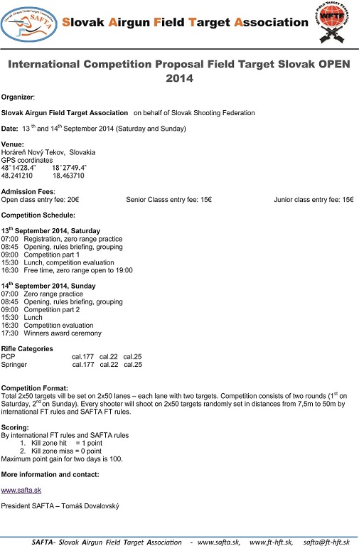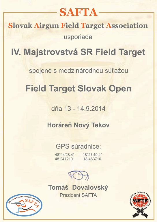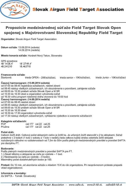 dovoľte mi aby som Vás pozval na už IV Medzinárodnú Field Target súťaž Slovak Open 2014 spojenú s Majstrovstvami Slovenska. Doposiaľ sa 3x konali majstrovstvá v lokalite Skýcov a v tomto roku nastala zmena. Majstrovstvá Slovenska budú na Horárni Nový Tekov. Súťaž sa bude konať dňa 13. a 14. septembra v sobotu a nedeľu a budú postavené dve samostatné dráhy. V rámci Slovak Open sú vítaný samozrejme všetci strelci teda nečlenovia SAFTA. Ak aj nie ste zaregistrovaný v prihlasovacom systéme, stačí to napísať sem, prípadne ss.