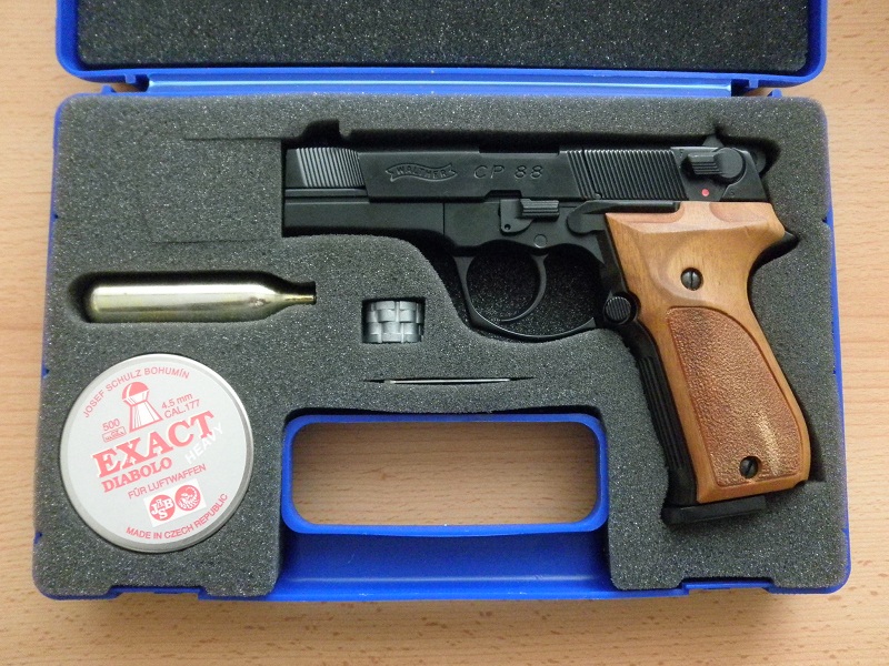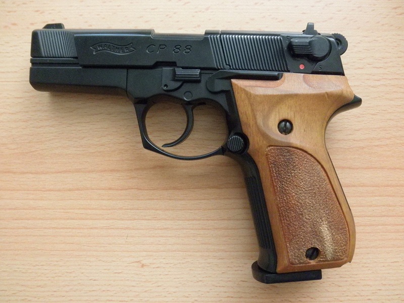 Je to pistoľ tvarovo identická so skutočnou zbraňou Walther P88. Celokovová konštrukcia s plastovou pažbou. Bombička sa vkladá do rukoväte. Osemranový venčekový zásobník na olovené diabolo je priamo v balení (2 kusy). Poistka pre zaistenie zbrane je samozrejmosťou pri tomto modeli. Zbraň je v prevedení SA/DA. Single Action - výstrel po natiahnutí kohútika a potom streľba automaticky. Double Action - kohútik sa nemusia prvýkrát naťahovať pre rýchlu streľbu Princíp systému CO2: Bombička sa vloží do zbrane a mechanickým uzavretím sa napichne na tŕň. Po stlačení spúšte narazí kohút na úderník ventilu a ventil sa otvorí. Tadiaľ začína prúdiť plynný CO2 z bombičky, ktorý vyženie strelu z hlavne. Obsah balenia: - Walther CP 88 - Plastový kufrík - Zásobník 2ks - Návod - Záručný list Vynikajúca replika Walther P88. Celokovové prevedenie je veľké plus. Veľmi dobre prepracovaná zbraň, zásobník venčekový oceľový. Technické parametre: - Kaliber :4,5 mm - Úsťová rýchlosť :130 m/s - Zásobník :8 rán - Strelivo : olovené diabolo - Typ mechanizmu :CO2 plyn - Pažba :plast/drevo - Dlžka hlavne :90,9 mm - Celková dlžka :180 mm - Hmotnosť :1040 g