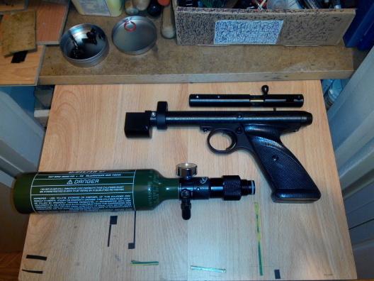 http://www.gatewaytoairguns.org/GTA/ind ... ic=35670.0 ten block kit bude z QB mal by pasovat.Je na nizzsi tlak do cca 900psi.Paintball flasa a CO2 maju okolo 800-850 psi vystupny tlak takze by malo stacit.