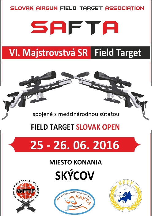 Dámy a páni, dovoľujem si Vás pozvať na VI. Medzinárodnú súťaž Field Target Slovak Open 2016 spojenú s Majstrovstvami Slovenska Field Target. Opäť sa súťaž bude konať v obci Skýcov v areáli chaty Breziny 25 a 26. júna 2016 (sobota, nedeľa). Budú postavené dve samostatné dráhy. Vítaní sú všetci, ktorí majú radi túto streleckú disciplínu. Tešíme sa na Vašu účasť.