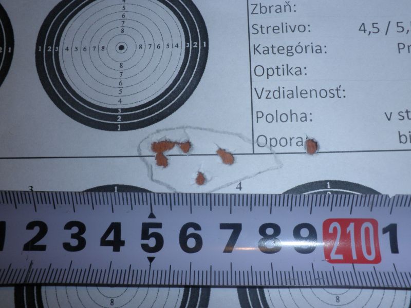Nuž ale tak som sa posunul o 9 metrov dalej na vzdialenosť 30m. Prvý terčík z online sútaže s JSB 4,51 a sústrel 18mm x 8mm. Potom JSB heavy a bolo to o dosť horšie (asi 3x 3,5 cm - neviem prečo, najskôr moja chyba). Potom JSB Exact 4,52 a sústrel 19mm x 7mm. Potom JSB RS a sústrel približne 20mm opísaná (takisto asi najskôr mojou chybou lebo po exactoch som pobehal ku terču a to ma tak trošičku rozkývalo). Nakoniec ľuby PO a musím povedať že to nebolo vôbec zlé. Dokonca lepšie ako RS-ky a Heavy 19mm x 20mm. Viec terčov som nerobil, ani nebolo kedy. Ja som nadpriemerne spokojný, a opakujem že to bolo strieľané s optikou Walther 4x32 ktorá je po HHF už dosť skopaná.