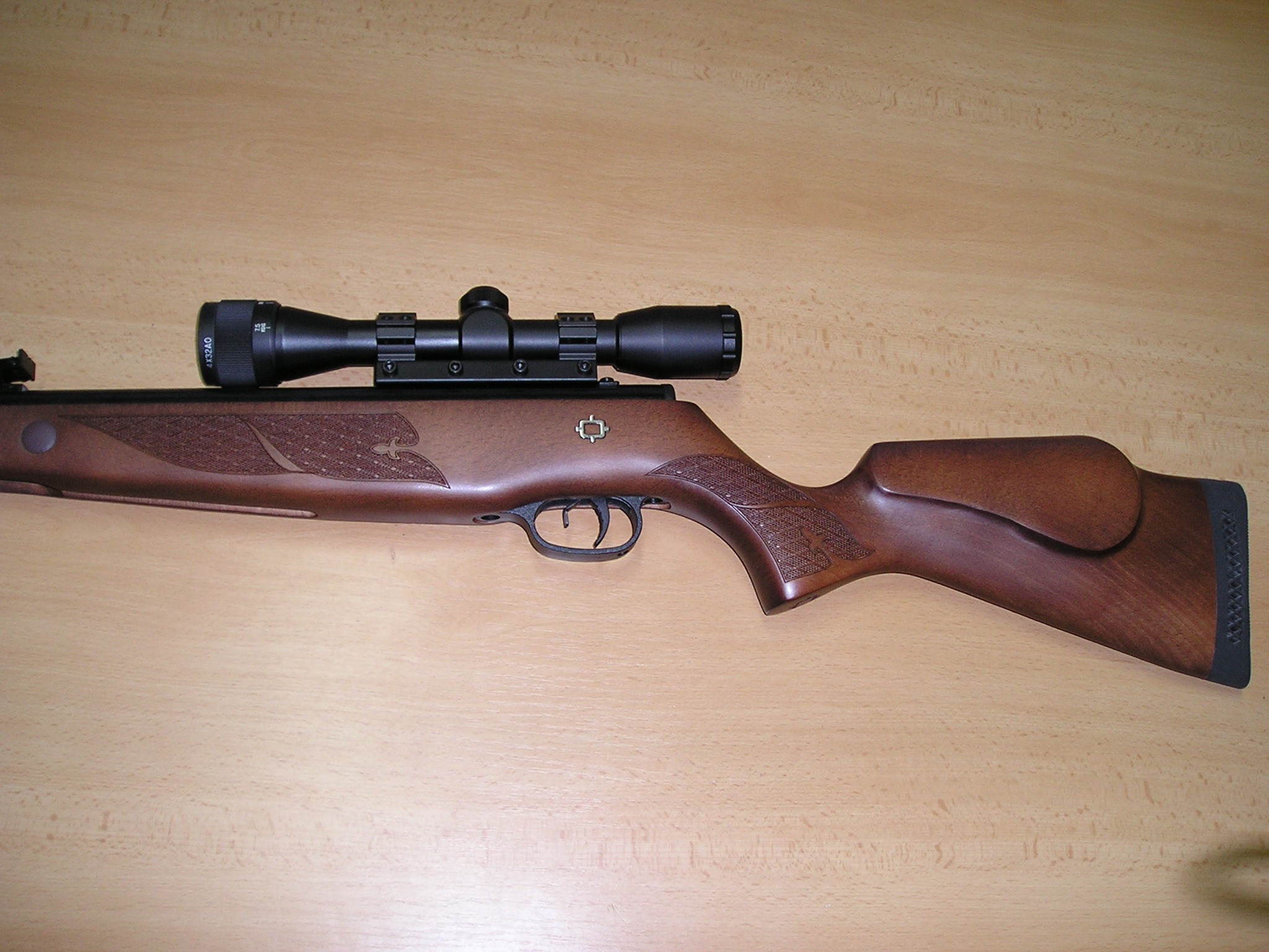Vahovo je to vzduchovka velmi prijemna, v rukach sa dobre drzi a aj oku sadne celkom lahodne. Pazba je polomatna s tmavsim nadychom, co dotvara celkovy dobry dojem z tejto zbrane. Prilicenie bez optiky je velmi dobre, s optikou ale budem musiet posunut tvar trochu vyssie, ale to neprekaza, sedi to dobre. Co sa ukoncenia pazby tyka, je tam osadena pryzova "botka" . Ma nadych do siva, ale to este upravim, aby to farebne ladilo a aby bola tmavsia. Jedine plastove veci som objavil na tejto vzduchovke tri, co je skoda, ale vyzera to pevne. Plastovy je kryt-obluk okolo spuste, kohutik spuste a poistka pred kohutikom. Pozeram na to, ale je to dost pevne a musel som sa lepsie prizriet, aby som zistil, ze je to z tvrdeneho plastu. Vlastne som to zistil podla dotyku, ze to nechladilo ako kov.