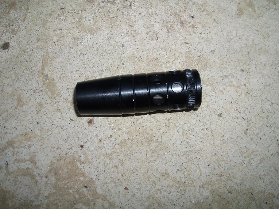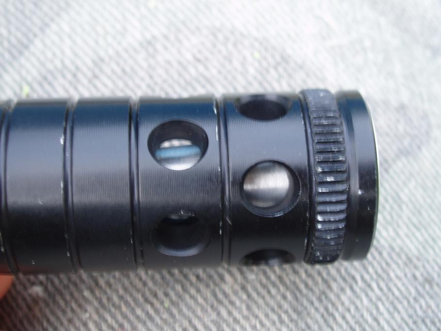 homemade kompenzator z okrasnej koncovky (FX,HATSAN),nemalo to využitie okrem zvýšenia hladiny zvuku to pred úpravou nerobilo asi nič iné,je tam vložený lievik začínajúci od úsťia hlavne asi 8-12mm nemeral som to presne, lebo pred dokončením prebehol test myslím si úspešne tak som viacej nelaboroval
