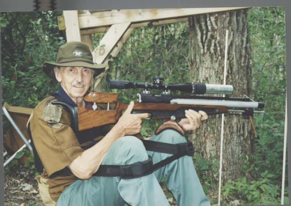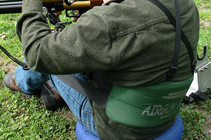 Z obrazkov vidno, ze strelec si natiahne na seba akesi remene, do ktore sa mu operaju o chrbat a do ktorych si oprie kolena. Tymto si navzajom fixuje kolena a chrbat a urcite ziskava vyhodu. Po chvili googlovania som tomu nasiel aj nazov - "body bench" a tu sa da aj kupit: