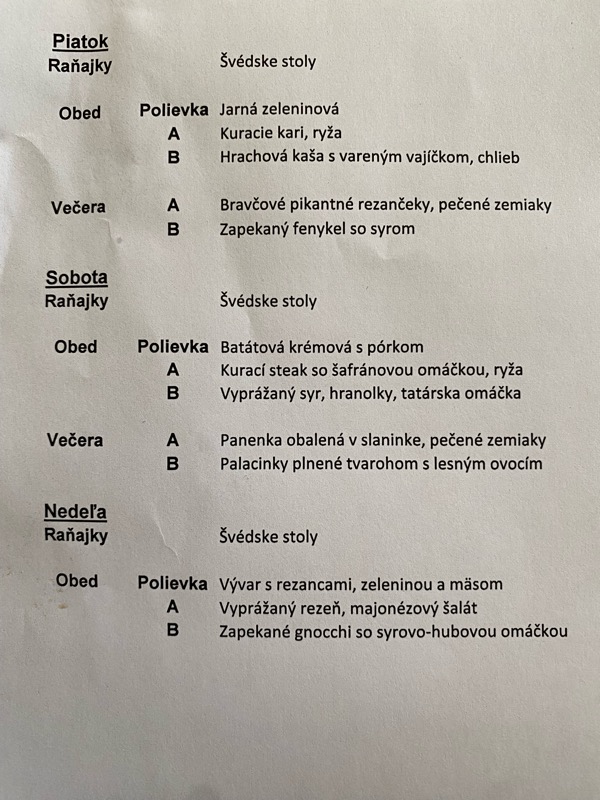 Pridavam jedalnicek na vikend. Nezabudnite si jedlo nahlasit na recepcii.
