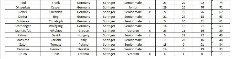 Tak ešte raz gratulujem Milanovi a Adamovi ale aj Dedemu jr. za tesné štvrté miesto ,Simone za tuším štvrté resp. piate a Ferovi ktorému aj keď sa niekedy nezadarilo tak náladu mal na jedničku, nič ho nedeptalo ako mňa a skončil niekde hádam do štyridsiateho miesta. V podstate sa jednalo o rovinu takže extrémne palmresty viac menej zbytočnosť a veľmi mi to pripomínalo naše začiatky na futbalových ihriskách. Ale prišiel vietor daždisko niekedy hmla a zákerný nemecký(taký u nás nemáme) vietor. Osobne ja prvý deň 37 sklopiek všetko mi išlo ako tak. V sobotu začiatok paráda čierne sklopky mi nevadili a podľa mňa najlahšia trať ale posledných 13 sklopiek samé nuly a ráno na nastrelovačke som zistil že komínok pretočený o 360 stupňou (a to mám akože nepretočitelný od Rowana), nedela zo začiatku celkom dobre ale konečne slniečko všetci sme sa tešili len moja (a nie len moja) optika nie a už to išlo do čerta, trapných 26 aj to mi slovinec nastavil klikanie a jednu povinnú "ranu" v stoji som si dal v sede na číslo sklopky aby som sa ubezpečil kam mi to lieta.