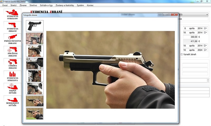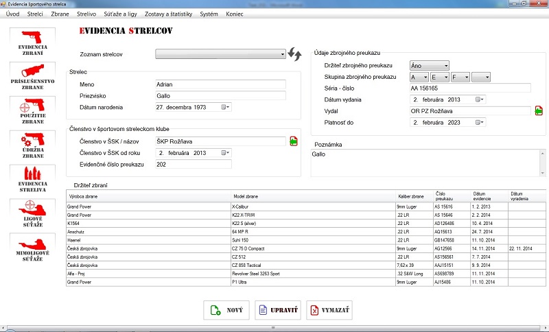 V tomto programe by som chcel viest vsetky potrebne agendy, ktore ako sportovy strelec evidujem. Aplikaciu som sa snazil navrhnut tak, aby sa v nej dala viest evidencia a zaznamy strelcov palnych, ale aj vzduchovkových zbrani.