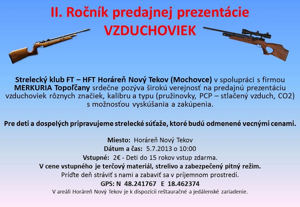 V piatok - sviatok :-) 5.7.2013 v spolupráci so streleckým klubom Nový Tekov usporiadame II.ročník predajnej prezentácie vzduchových zbraní a príslušenstva. Spolu s prezentáciou budeme organizovať strelecké súťaže pre deti i dospelých so zaujímavými cenami. Prídte deň stráviť s nami a zabaviť sa v príjemnom prostredí Horárne Nový Tekov. Symbolické vstupné 2 eurá budú použité na podporu športového streleckého klubu.