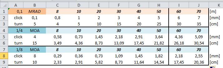 - veľmi zjednodušene a platí na akomkoľvek funkčnom puškohľade, ak jeden klik na 10 metroch posunie priemet zámernej osnovy na terči o 1 mm, tak na 70 metroch to bude o 7 mm (70m/10m=7x) podobnosť trojuholníkov - veta "SUS"